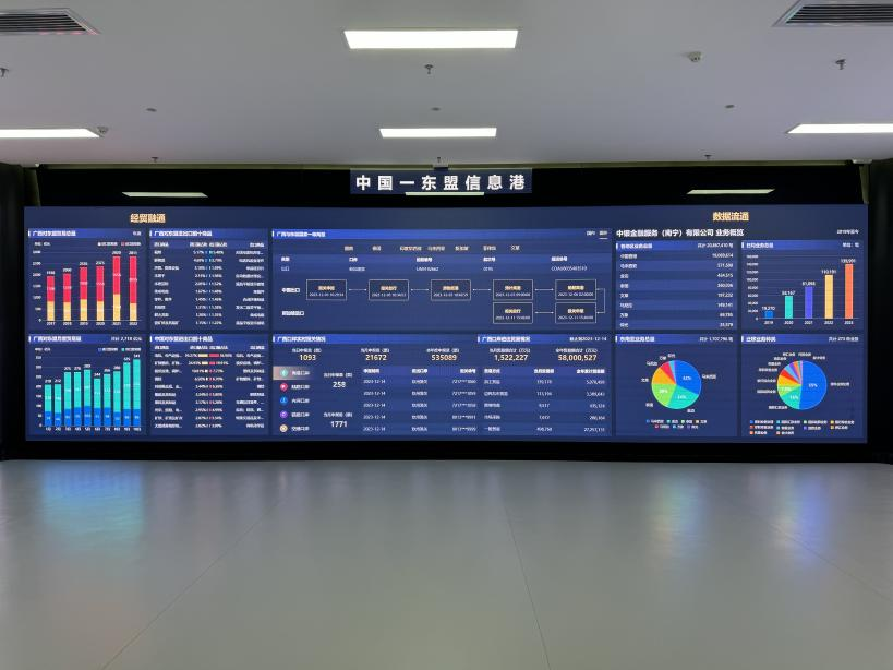 在中國—東盟信息港數(shù)字經(jīng)濟(jì)展示中心,3米高的電子顯示屏上,邊民互市貿(mào)易的數(shù)字在不斷跳動。這個(gè)集交易、通關(guān)、金融和物流為一體的中國—東盟“商貿(mào)通”數(shù)字化平臺,可以為客戶提供跨境貿(mào)易全鏈條、數(shù)字化、一站式綜合服務(wù),實(shí)現(xiàn)邊民互市當(dāng)天交易、當(dāng)天通關(guān)。