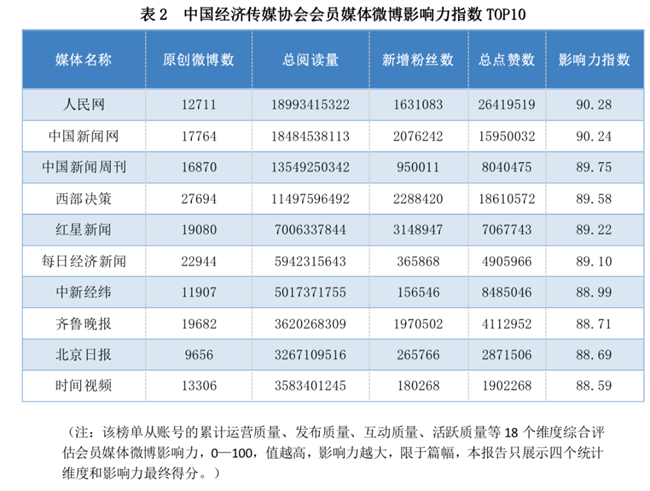 人民網(wǎng)、中國新聞網(wǎng)、中國新聞周刊、西部決策、紅星新聞、每日經(jīng)濟新聞、中新經(jīng)緯、齊魯晚報、北京日報、時間視頻10家媒體進入“2023 中國經(jīng)濟媒體微博影響力指數(shù)TOP10”榜單。