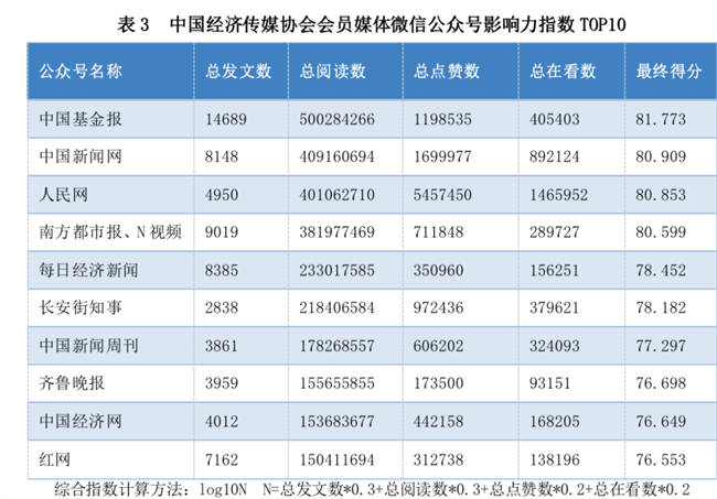 中國基金報、中國新聞網(wǎng)、人民網(wǎng)、南方都市報、每日經(jīng)濟新聞、長安街知事、中國新聞周刊、齊魯晚報、中國經(jīng)濟網(wǎng)、紅網(wǎng)10家媒體入選“中國經(jīng)濟傳媒協(xié)會會員媒體微信公眾號影響力指數(shù)TOP10”榜單。