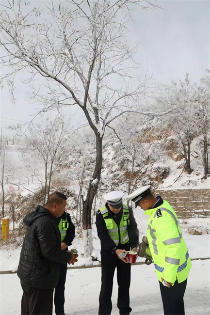 在巡邏途中,民輔警發(fā)現(xiàn)部分車輛滯留在路上。他們?yōu)闇赳{乘人員送上泡面等物資,讓各位駕乘人員感受到了延長公安交警的濃濃暖意,舒緩駕乘人員旅途滯留的焦慮情緒。同時,民警提醒駕駛?cè)思皶r關注天氣情況和路況信息,確保行車安全。