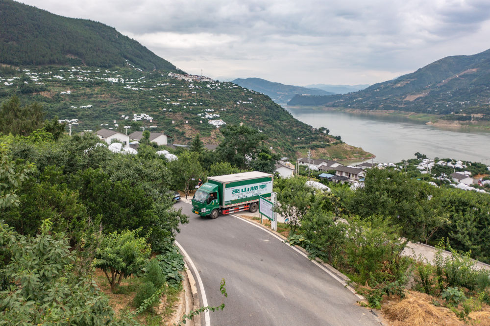 ↑重慶市巫山縣曲尺鄉(xiāng)柑園村,裝載有巫山脆李的中國郵政物流車行駛在村內(nèi)(無人機照片,6月28日攝)。過去因為物流不便,經(jīng)過幾天的運輸后,脆李的品質(zhì)和口感會受到影響?,F(xiàn)在,航空快遞的開通,讓巫山脆李快速走向全國。