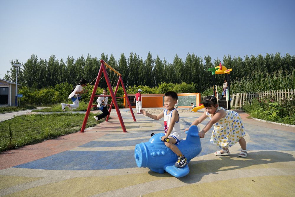 ↑孩子們在河北省唐山市豐南區(qū)趙新莊村一處游園內(nèi)玩耍(7月19日攝)。豐南區(qū)因地制宜實施美麗鄉(xiāng)村提升工程,通過改造農(nóng)村閑置破舊房屋、清理溝渠坑塘等措施,300余個行政村建起鄉(xiāng)村游園。