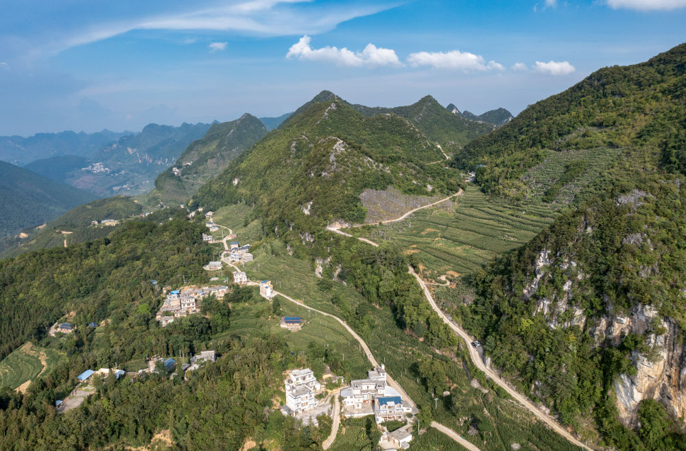 ↑云南省文山壯族苗族自治州西疇縣山間公路,右側(cè)這條是巖頭村村民小組長李華明帶領(lǐng)群眾修建的最后一公里進村道路(無人機照片,7月26日攝)。