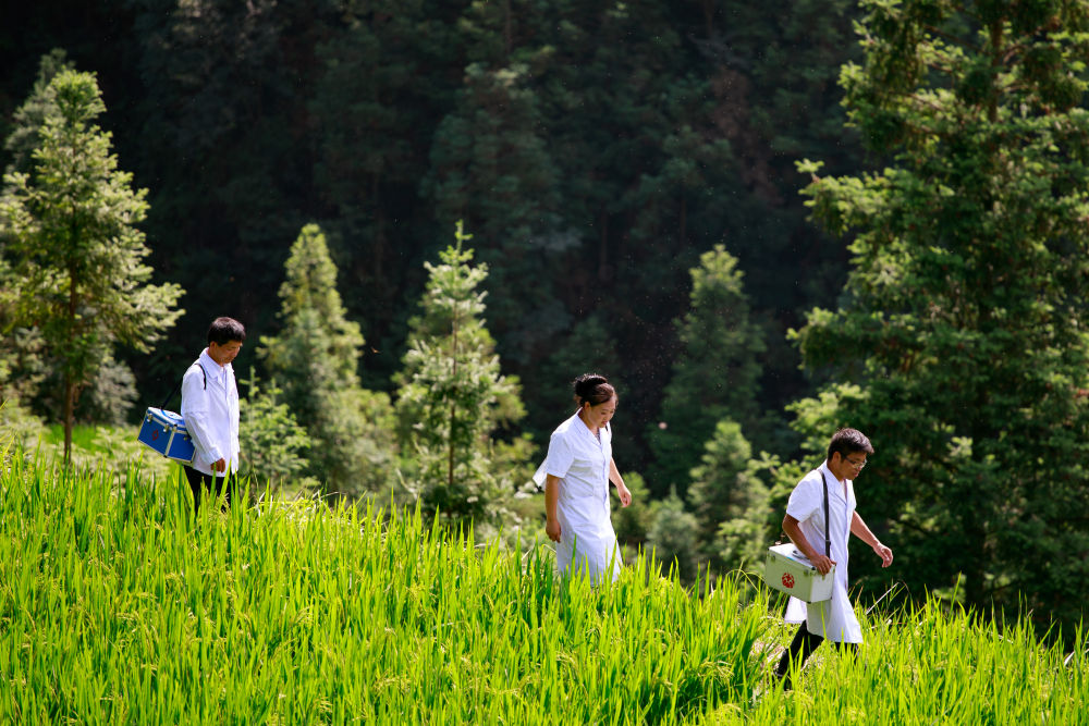 ↑貴州省黔東南苗族侗族自治州榕江縣忠誠鎮(zhèn),村醫(yī)吳昌喜(左)、吳濤(右)、項昌會走在榕江縣忠誠鎮(zhèn)定弄村郊外的田埂上(8月16日攝)。吳昌喜和兒子吳濤、兒媳項昌會都是村醫(yī),呵護著三個村820多戶、3660多名群眾的健康。