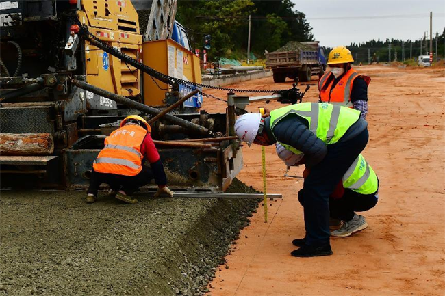 這次水穩(wěn)層攤鋪施工的是海濱一路,長(zhǎng)約1745米,路寬38米。該路段已于2023年3月31日開始施工,在先后完成軟基處理、路基工程、雨水管道、電力管道、給水管道工程后,開始了水穩(wěn)層攤鋪施工。