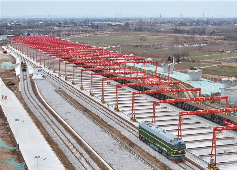 1月21日,中鐵十一局西延高鐵閻良鋪軌基地(無人機照片)。 當日,隨著一列運載500米長鋼軌的列車駛?cè)胫需F十一局西延高鐵閻良鋪軌基地,西(安)延(安)高鐵進入存軌施工階段,為后續(xù)鋪軌工作奠定基礎。項目建成后,西安至延安的運行時間將從目前的2.5小時縮短至1小時左右。 新華社記者 張博文攝