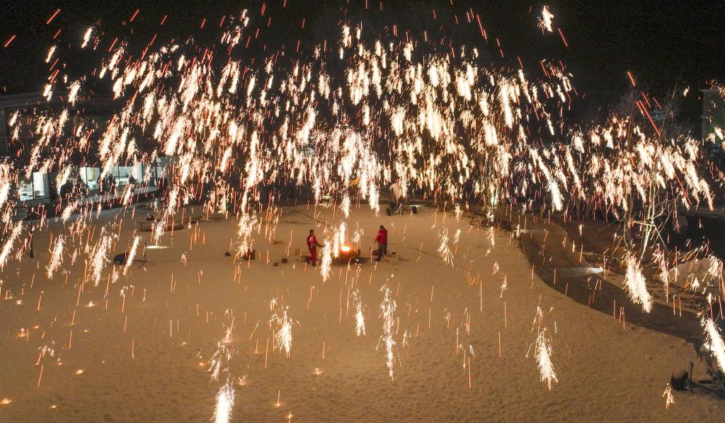 1月13日,民間藝人在河北省承德市興隆縣一景區(qū)為游客表演“打樹花”(無人機(jī)照片)。新華社發(fā)(劉滿倉 攝)