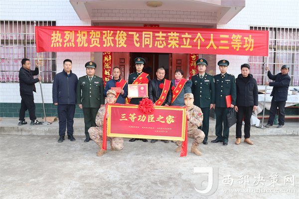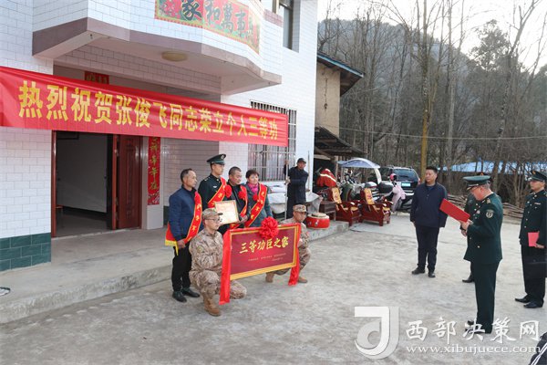 西部決策網(wǎng)訊 律回歲晚,年味漸濃。在陜西省漢中市略陽(yáng)縣徐家坪鎮(zhèn)小山村張家莊,幾位身著軍裝的軍人手捧喜報(bào),抬著三等功臣之家的牌匾,在人群中格外的顯眼。由縣人武部,退役軍人事務(wù)局,鎮(zhèn)村領(lǐng)導(dǎo)組成的隊(duì)伍帶著新年的問(wèn)候和祝福,為榮獲三等功的張俊飛家庭送來(lái)立功喜報(bào)、三等功臣之家的牌匾和慰問(wèn)金,張俊飛所在的部隊(duì),委派專人到地方上聯(lián)合當(dāng)?shù)夭块T(mén)將這份殊榮親自送到張俊飛的家里,給小山村增添無(wú)限的喜慶和榮光。