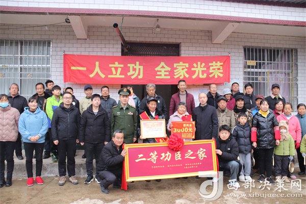 西部決策網(wǎng)訊 春節(jié)將至萬(wàn)家慶,鑼鼓喧天送喜來(lái)。2月2日,略陽(yáng)縣馬蹄灣鎮(zhèn)付家山村鑼鼓聲、鞭炮聲,熱鬧非凡??h人武部、縣退役軍人事務(wù)局,鎮(zhèn)、村三級(jí)領(lǐng)導(dǎo)為榮立二等功的付建強(qiáng)家屬送來(lái)立功喜報(bào)和功臣牌匾。