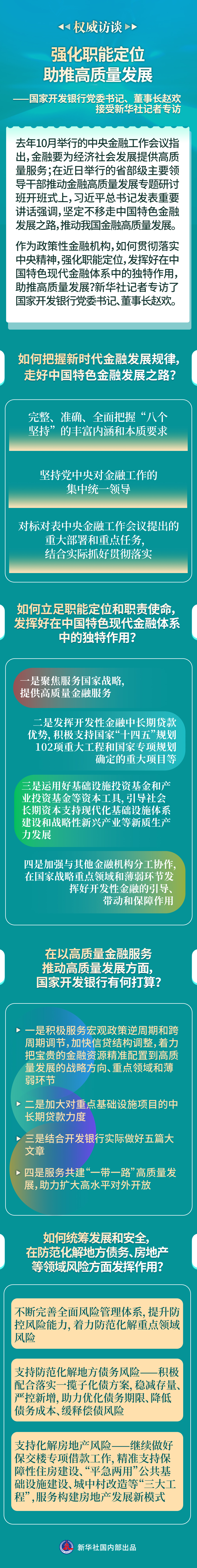 作為政策性金融機(jī)構(gòu),如何貫徹落實(shí)中央精神,強(qiáng)化職能定位,發(fā)揮好在中國(guó)特色現(xiàn)代金融體系中的獨(dú)特作用,助推高質(zhì)量發(fā)展?新華社記者專訪了國(guó)家開(kāi)發(fā)銀行黨委書(shū)記、董事長(zhǎng)趙歡。