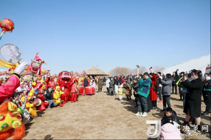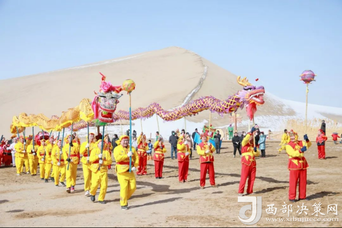 雪后的沙山與熱鬧非凡的社火表演,交織出一幅令人心花怒放的秀麗畫卷,游人近距離觀看社火表演,鉆龍、合影,祈福納祥,眾人歡聲笑語不斷,在社火中感受中國(guó)傳統(tǒng)節(jié)日獨(dú)有的民俗魅力,盡享年味敦煌。