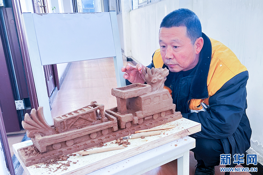 劉建強在宿舍雕刻泥塑“龍頭軌道車”。張贏弘 攝