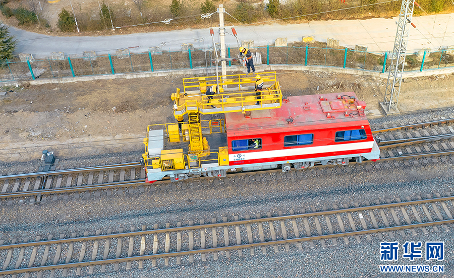 春運期間,在隴海鐵路虢鎮(zhèn)至陽平區(qū)段,劉建強和他的工友們在供電接觸網(wǎng)軌道作業(yè)車上進行檢修作業(yè)。劉一江 航拍