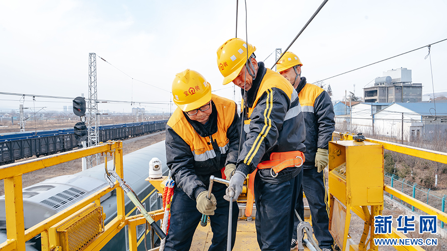 在隴海鐵路虢鎮(zhèn)至陽平區(qū)段,劉建強和他的工友在供電接觸網(wǎng)軌道作業(yè)車上緊固接觸網(wǎng)吊弦。趙 濤 攝