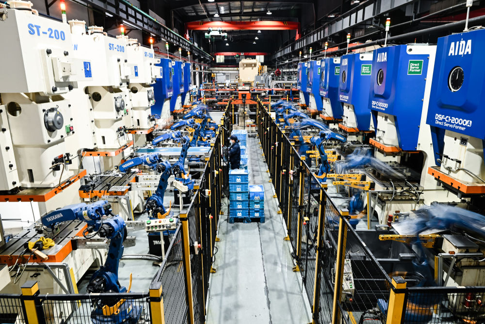 2024年2月28日,在“江蘇省專精特新中小企業(yè)”無(wú)錫微研精工科技有限公司智能生產(chǎn)車(chē)間,機(jī)械臂在作業(yè)。新華社記者 季春鵬 攝