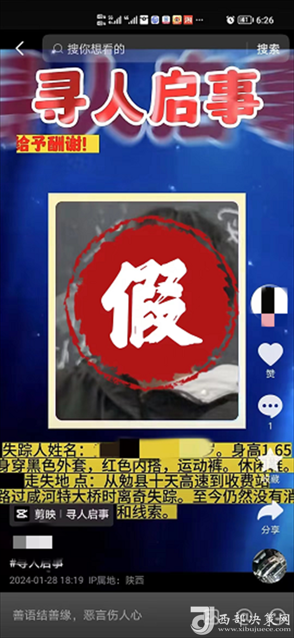 2024年1月28日晚,網(wǎng)民周某因與同學(xué)黃某在網(wǎng)上聊天過程中發(fā)生口角。周某為發(fā)泄情緒報(bào)復(fù)黃某,在短視頻平臺(tái)使用黃某照片,編造黃某在勉縣十天高速與咸河大橋之間走失至今沒有線索的謠言,此網(wǎng)絡(luò)謠言造成不良社會(huì)影響。